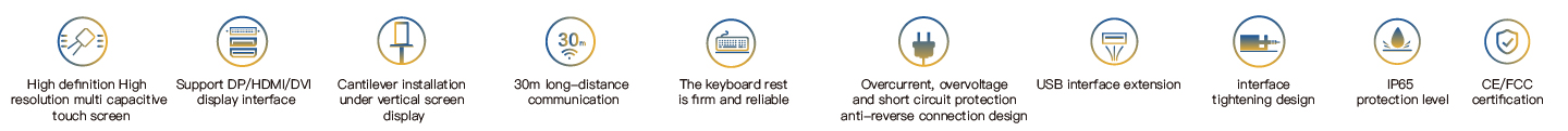 The PDX-3721 is an industrial touch panel with a lower cantilever mounting. It features vertical screen display and is equipped with a keyboard stand. It is configured with a 21.5 "high-definition LCD screen with a resolution of 1920x1080 and a projected multi-touch capacitive screen. It supports three signal transmission interfaces: HDMI, DVI and DP, as well as multiple USB2.0 interface expansions. The maximum communication distance between the PC and the touch panel can reach 30 meters, and the entire machine is powered by DC24V. The front panel has an IP65 protection rating. All interfaces are designed with fastening and have passed CE/FCC certification, making it suitable for demanding human-machine interaction industrial sites.