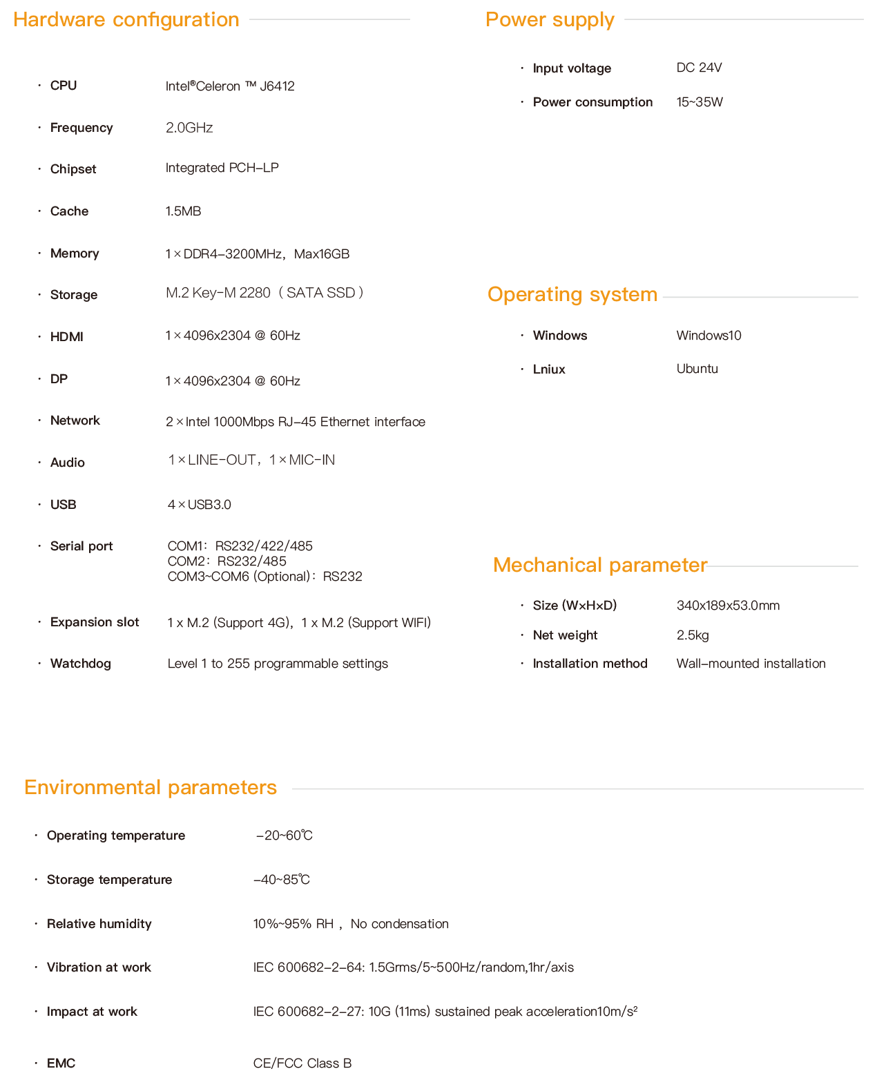 EPC-1662 is a fanless industrial computer based on the high-performance Intel?Celeron? J6412 processor. The product is equipped with a rich array of I/O interfaces, including two Intel GbE gigabit network ports. It features 4 USB3.0 ports, 4 optional USB2.0 interfaces, and external HDMI and DP display interfaces that support synchronous or asynchronous dual display. 1 RS232/RS422/RS485, 1 RS232/RS485, 4 optional RS232 serial ports. One M.2 expansion slot for expanding 3G/4G modules. 1 M.2 expansion slot for wireless WIFI expansion. 1 M.2 hard disk interface, SSD supporting SATA protocol. The system IO interface is designed with an EMC circuit to ensure the reliability of the product and a lower failure rate. The product features an exquisite and robust design. The large area of aluminum fins quickly dissipates the heat from the processor. The fanless and fully enclosed structure effectively prevents dust from entering, ensuring the product operates reliably for a long time in harsh industrial environments. The whole machine is powered by DC12V to 24V. All interfaces are designed with fastening and have passed CE/FCC certification, making it suitable for harsh industrial sites. The operating system supports Windows10 and Linux.
