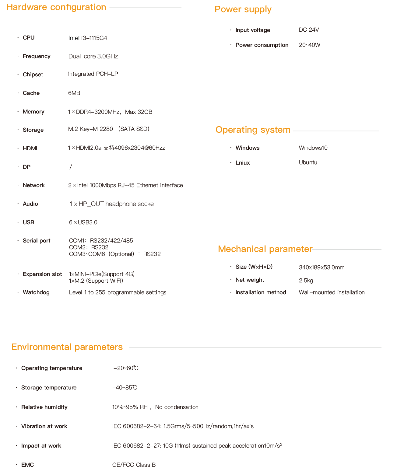 EPC-2832 is a fanless industrial computer based on the IntelRIntel Core i3-1115G4 high-performance processor. Supports HDMI display interface. The product is equipped with rich I/O interfaces and has 2 Intel GbE gigabit network ports. 6 USB3.0 ports,4 optional USB2.0 interfaces,1 RS232/RS422/RS485 port,1 RS232 port,4 optional RS232 serial ports. 1 1*MINI-PCle expansion slot for expanding 3G/4G modules,1 *M.2 expansion slot for expanding wireless WIFI,1 M.2 hard disk interface for supporting SATA protocol SSD. The system IO interface is equipped with an EMC circuit, ensuring the reliability of the product and a lower failure rate. The product's appearance design is exquisite and robust. The large-area aluminum fin design quickly dissipates the heat of the processor. The fanless and fully enclosed structure effectively prevents dust from entering, ensuring the product operates reliably for a long time in harsh industrial environments. The whole machine is powered by DC12V to 24V. All interfaces are designed to be fastened tightly and have passed CE/FCC certification. It can be applied to harsh industrial sites. The operating system supports Windows10 and Linux.