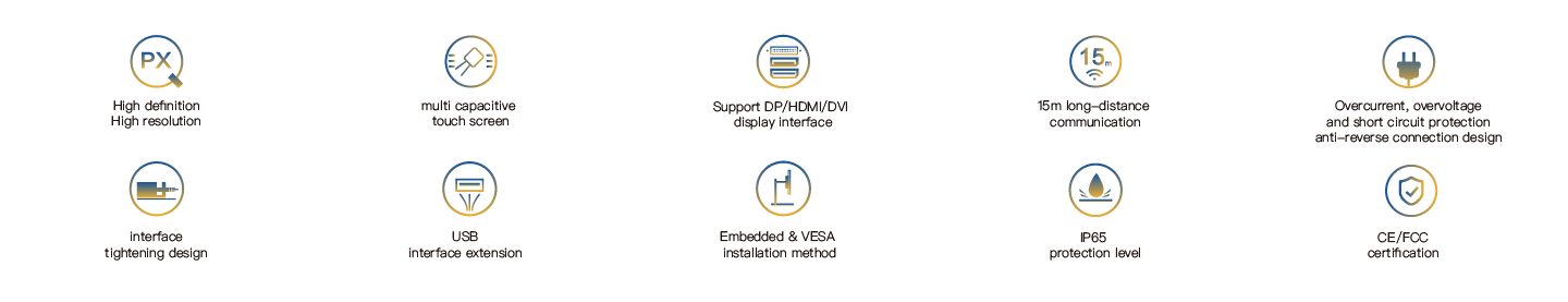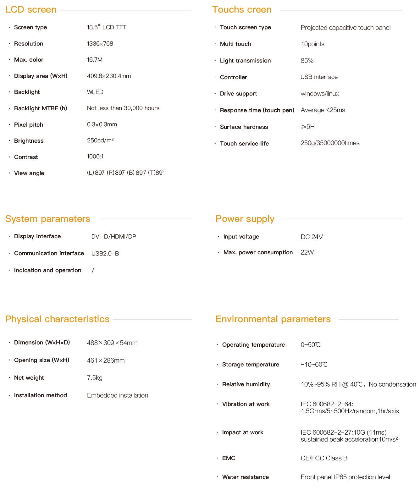 NPD-184 is an embedded ultra-thin industrial touch panel. It is equipped with an 18.5-inch high-definition LCD screen with a resolution of 1366*768 and a projected multi-point capacitive touch screen. It supports three signal transmission interfaces: HDMI, DVI and DP, as well as multiple USB interface expansions. The maximum communication distance between the PC and the touch panel can reach 15 meters, and the entire machine is powered by DC24V. The front panel has an IP65 protection rating. All interfaces are designed with fastening and have passed CE/FCC certification, making it suitable for demanding human-machine interaction industrial sites.