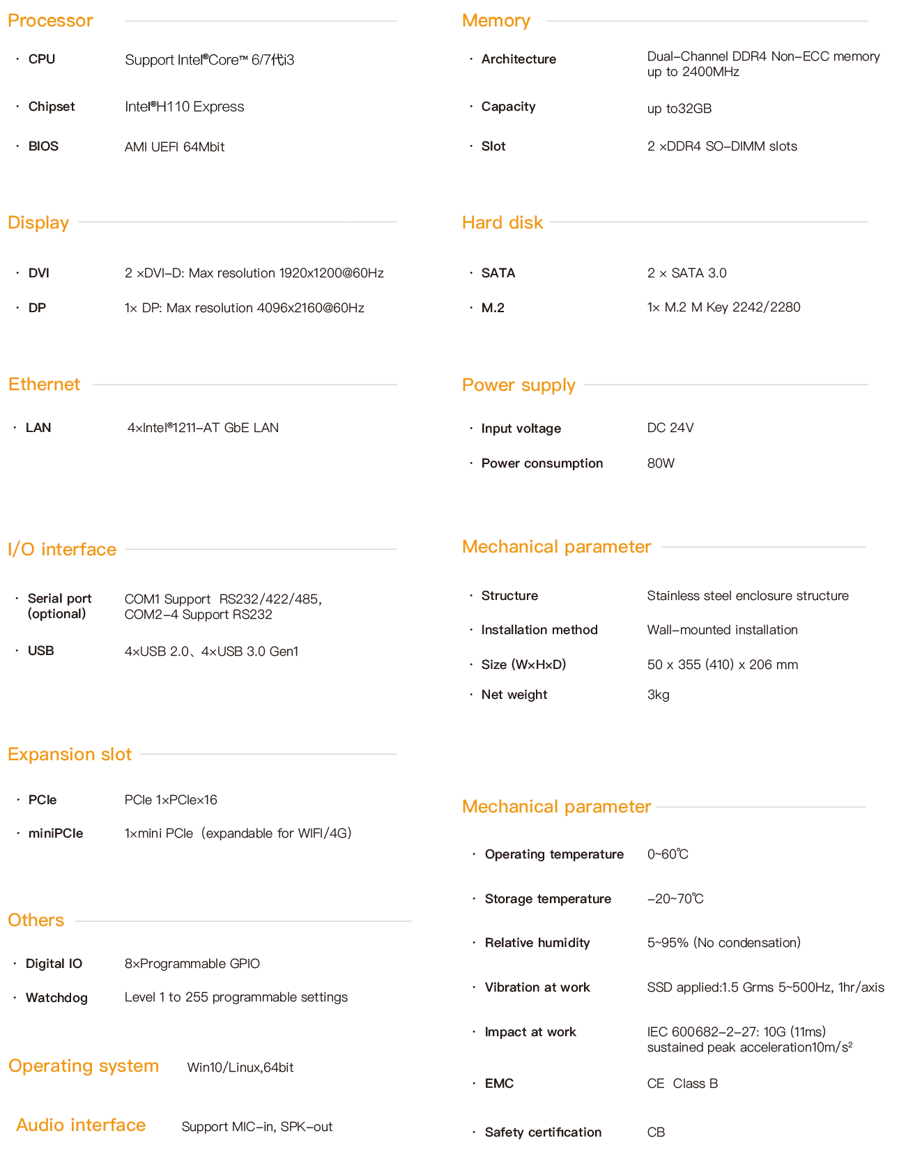 EPC-9934L is an industrial computer based on the high-performance Intel Core 6th / 7th generation processors. Configurable large-capacity solid-state SSD, with a maximum memory capacity of 32G, and supports DVI/DP display interfaces. It has 4 Intel GbE gigabit network ports, 4 USB3.0 interfaces, 4 USB2.0 interfaces. COM1 supports RS232/RS422/RS485, and COM2 supports RS232. The whole machine is powered by 24V DC. All interfaces are designed with fastening and have passed CE/FCC certification. It can be applied to harsh industrial sites, and the operating system supports Windows10 and Linux.