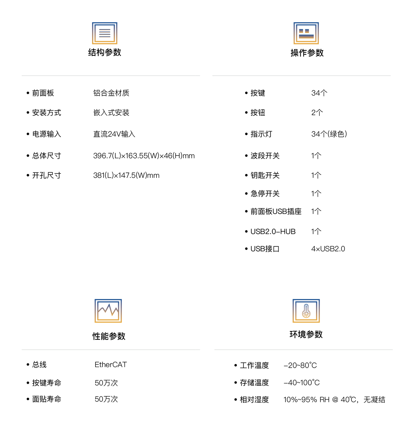 EC-8102是一款高性能基于EtherCat工業(yè)以太網(wǎng)總線的操作面板,實(shí)現(xiàn)高速而且可靠的人機(jī)互動(dòng),作為一款專用HMI操作面板,配備了34個(gè)操作按鍵,34個(gè)狀態(tài)指示燈,1個(gè)21檔速度進(jìn)給波段開關(guān),1個(gè)USB直通母座,1個(gè)4口USB2.0-HUB,以及獨(dú)立的鑰匙開關(guān),啟動(dòng)按鈕,停止按鈕和急停開關(guān)。整機(jī)采用抗干擾設(shè)計(jì),適應(yīng)各種電磁環(huán)境復(fù)雜的工業(yè)現(xiàn)場(chǎng)。通過掛鉤實(shí)現(xiàn)嵌入式安裝,便于安裝與維護(hù)。