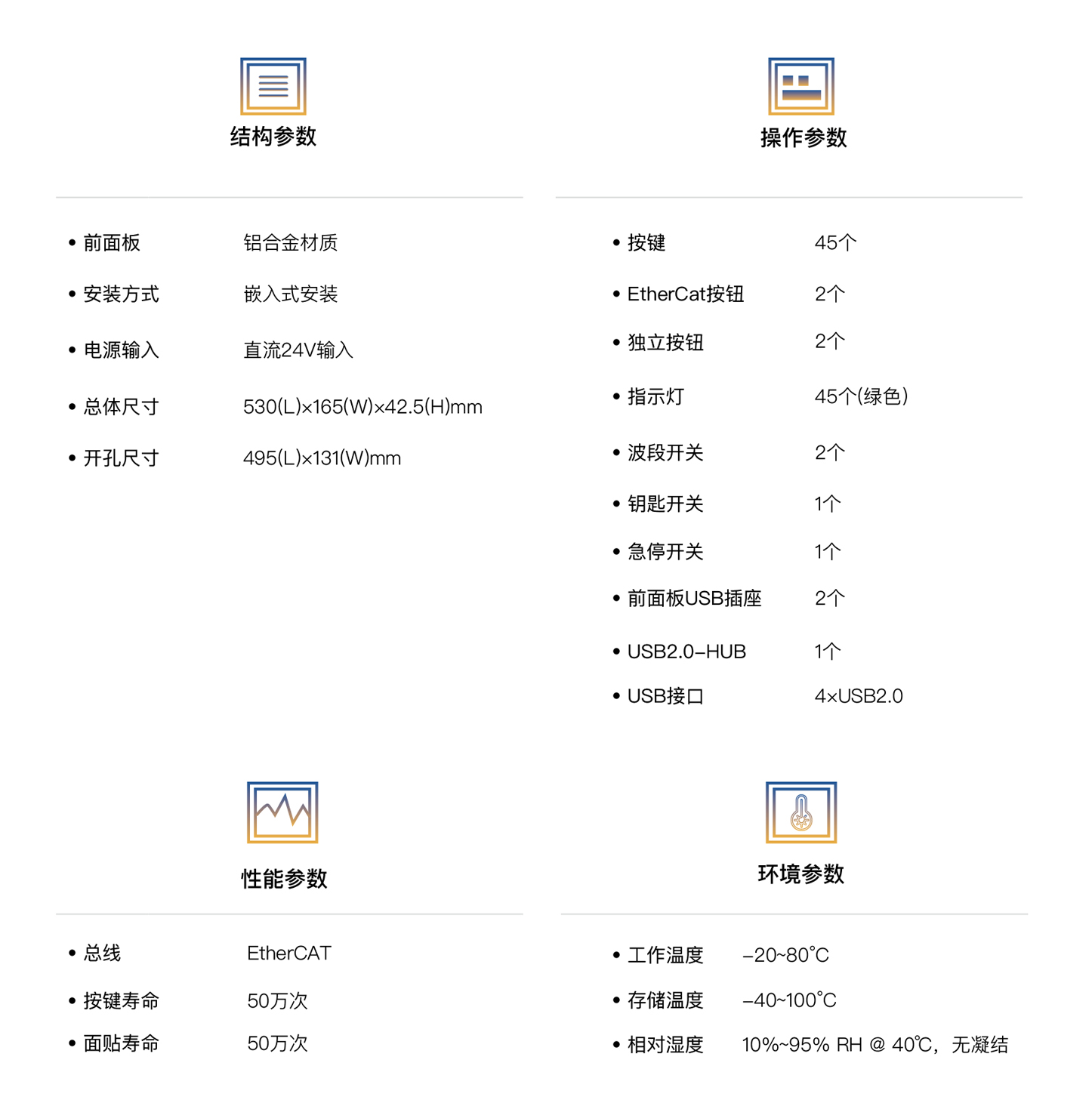 EC-8103是一款高性能基于EtherCat工業(yè)以太網(wǎng)總線的操作面板,實(shí)現(xiàn)高速而且可靠的人機(jī)互動(dòng),作為一款專用HMI操作面板,配備了45個(gè)操作按鍵,45個(gè)狀態(tài)指示燈,2個(gè)21檔格雷碼波段開關(guān), 1個(gè)4口USB2.0-HUB,1個(gè)鑰匙開關(guān),1急停開關(guān),4個(gè)帶燈按鈕開關(guān),整機(jī)采用抗干擾設(shè)計(jì),適應(yīng)各種電磁環(huán)境復(fù)雜的工業(yè)現(xiàn)場。通過掛鉤實(shí)現(xiàn)嵌入式安裝,便于安裝與維護(hù)。