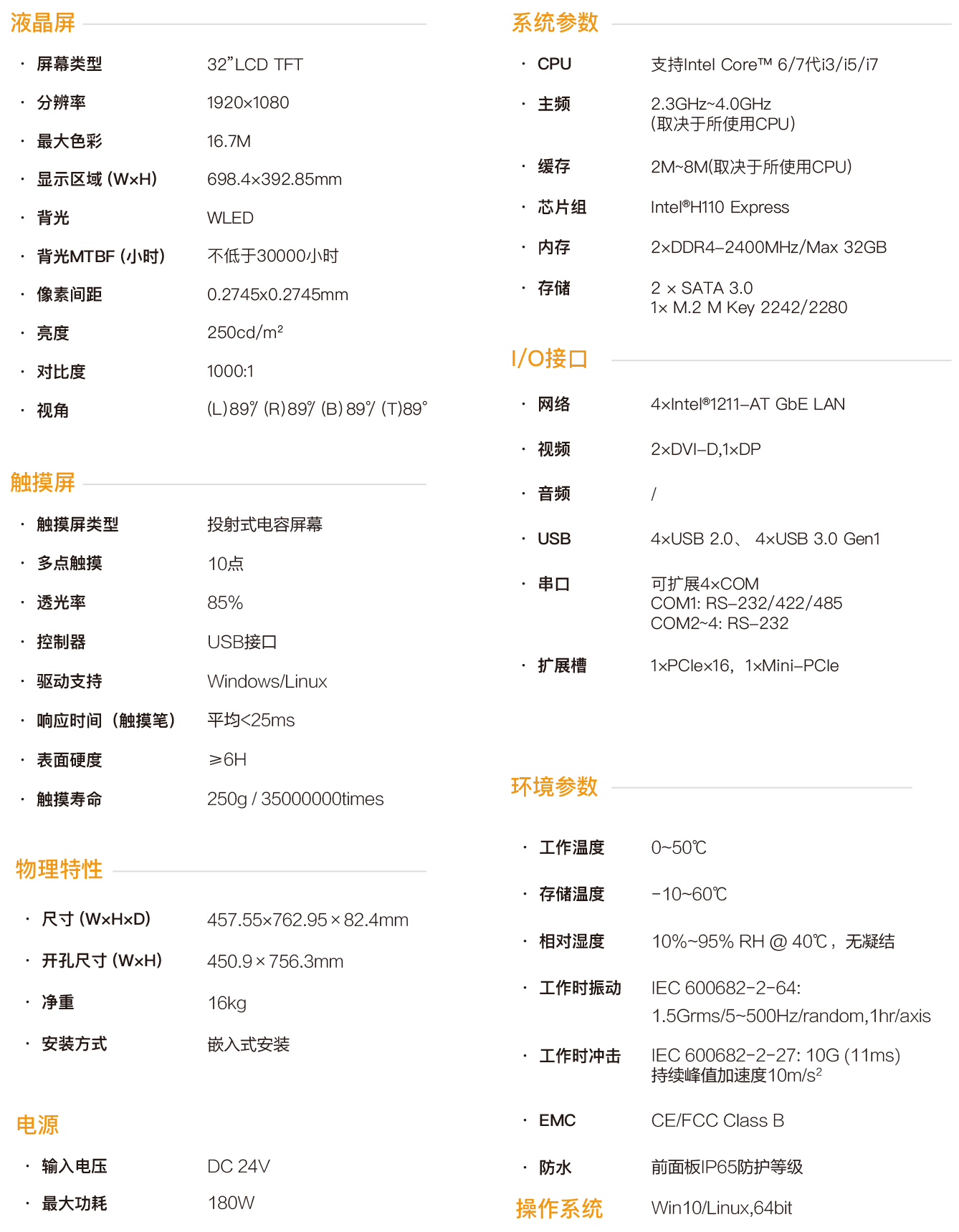 HPC-9632是一款工業(yè)型電容觸控平板電腦,將工業(yè)顯示和觸摸屏技術相結合,產(chǎn)品結構緊湊、易于安裝、操控方便,是一款高效能、高可靠的工業(yè)電腦系統(tǒng),整機采用32寸分辨率為1920*1080的高清液晶顯示屏,色彩豐富細膩,視角寬闊,24V直流供電,采用投射式10點電容屏,主機部分搭載Intel Core 6/7代CPU,可配置大容量固態(tài)SSD,內(nèi)存支持最大32G容量。 HPC-9632支持掛鉤式嵌入式安裝,前面板符合IP65防水防塵標準,杜絕安裝在控制柜時因現(xiàn)場飛濺的水滴進入,高強度全鋼型箱體結構,具有抗沖擊和振動防護功能,尤其是專門的EMC設計使得整機具有優(yōu)秀的抗干擾能力,能夠適應工業(yè)現(xiàn)場惡劣的工作環(huán)境,廣泛應用于工廠自動化、機械制造、數(shù)控設備、紡織設備、通訊網(wǎng)絡以及電力自動化等強干擾的工業(yè)現(xiàn)場。