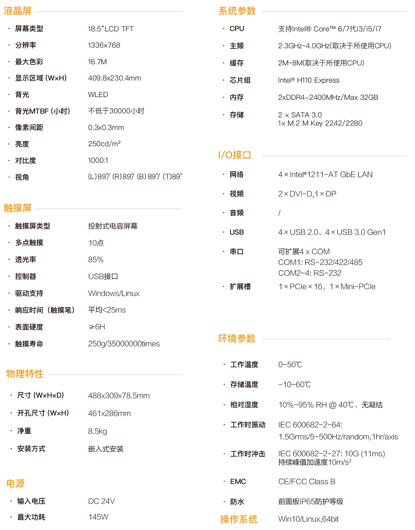 NPC-184i是一款工業(yè)型電容觸控平板電腦,將工業(yè)顯示和觸摸屏技術(shù)相結(jié)合,產(chǎn)品結(jié)構(gòu)緊湊、易于安裝、操控方便,是一款高效能、高可靠的工業(yè)電腦系統(tǒng),整機(jī)采用18.5寸分辨率為1366×768的高清液晶顯示屏,色彩豐富細(xì)膩,視角寬闊,24V直流供電,采用投射式10點電容屏,主機(jī)部分搭載Intel Core 6/7代CPU,可配置大容量固態(tài)SSD,內(nèi)存支持最大32G容量。 NPC-184i支持掛鉤式嵌入式安裝,前面板符合IP65防水防塵標(biāo)準(zhǔn),杜絕安裝在控制柜時因現(xiàn)場飛濺的水滴進(jìn)入,高強(qiáng)度全鋼型箱體結(jié)構(gòu),具有抗沖擊和振動防護(hù)功能,尤其是專門的EMC設(shè)計使得整機(jī)具有優(yōu)秀的抗干擾能力,能夠適應(yīng)工業(yè)現(xiàn)場惡劣的工作環(huán)境,廣泛應(yīng)用于工廠自動化、機(jī)械制造、數(shù)控設(shè)備、紡織設(shè)備、通訊網(wǎng)絡(luò)以及電力自動化等強(qiáng)干擾的工業(yè)現(xiàn)場。