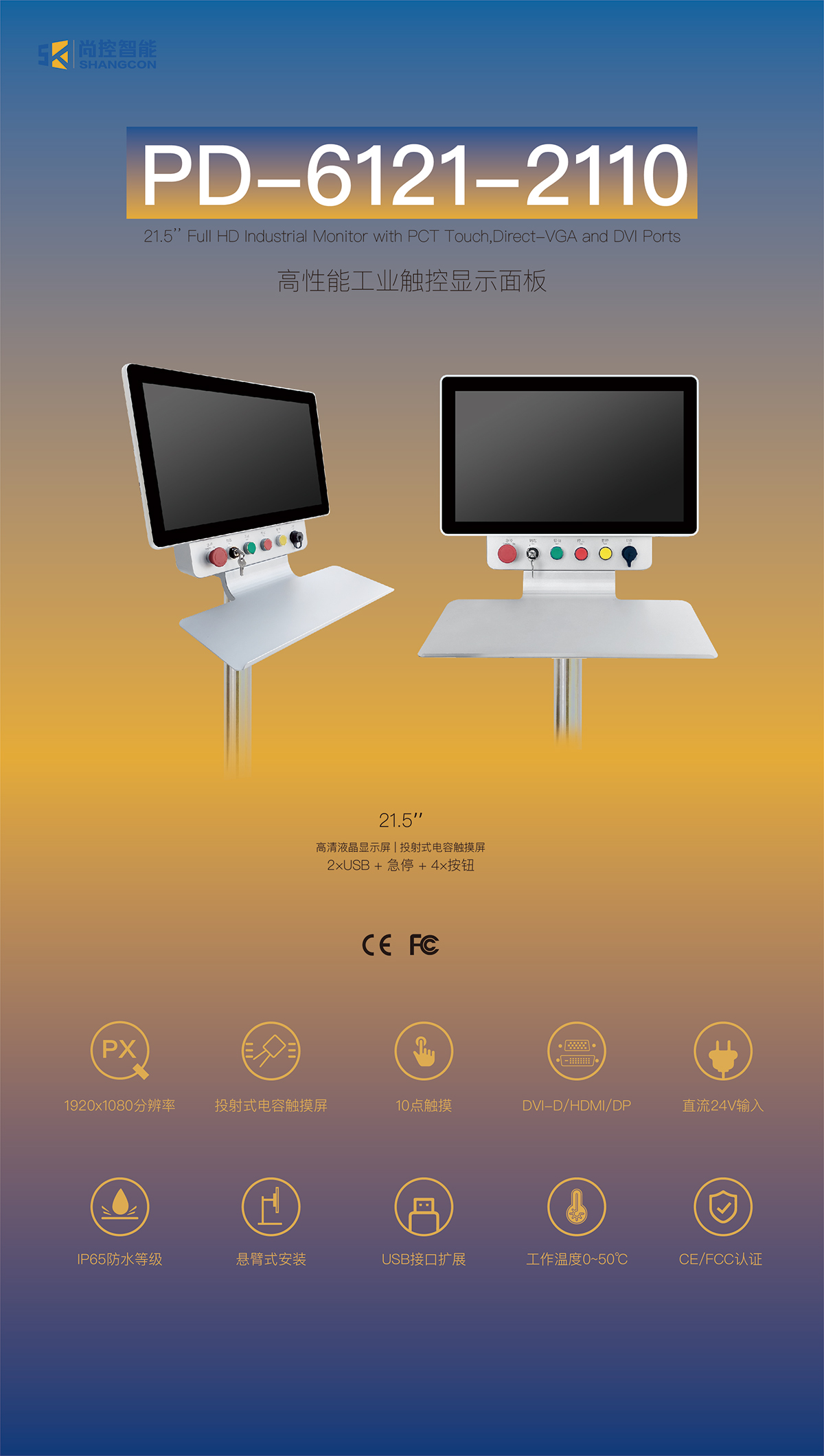 PD-6121-2110是一款高性能工業(yè)操控面板,配備21.5寸液晶屏、多點(diǎn) 透射式電容觸摸屏、5個(gè)帶指示燈的電氣控制按鈕,以及工業(yè)鍵盤(pán)支架,整機(jī)采用一體化工業(yè)設(shè)計(jì),操控方便,維護(hù)簡(jiǎn)單,非常 適合數(shù)控設(shè)備的配套使用,高清液晶顯示支持DVI-D、HDMI、 DP三種信號(hào)接口; 電源接頭采用緊固型綠色端子,防止使用過(guò)程 中意外脫落,觸摸屏軟硬件系統(tǒng),采用抗干擾設(shè)計(jì),在大功率電機(jī)、伺服等干擾,保證操作準(zhǔn)確可靠的觸控體驗(yàn),DVI支持長(zhǎng)距 離通訊,在復(fù)雜電磁環(huán)境下,保持畫(huà)質(zhì)清晰穩(wěn)定,內(nèi)置 USB-HUB,用戶(hù)可同時(shí)接入多個(gè)U盤(pán)、藍(lán)牙鼠標(biāo)鍵盤(pán)等。