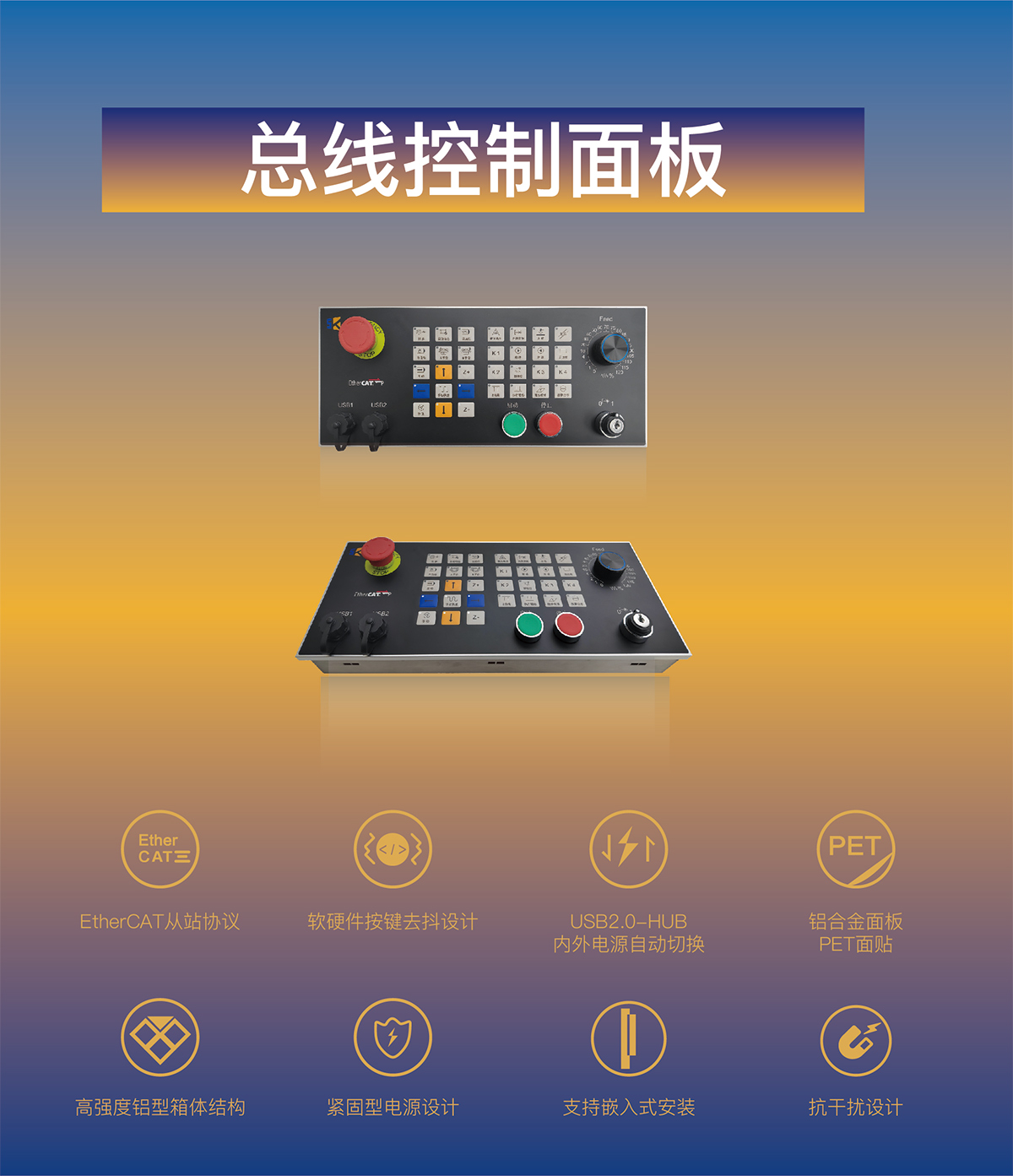 EC-8101是一款高性能基于EtherCAT工業(yè)以太網(wǎng)總線的操作面板,實(shí)現(xiàn)高速而且可靠的人機(jī)互動(dòng),作為一款專用HMI操作面板,配備了31個(gè)操作按鍵,31個(gè)狀態(tài)指示燈,1個(gè)21檔速度進(jìn)給波段開關(guān),2個(gè)USB直通母座,1個(gè)4口USB2.0-HUB,獨(dú)立鑰匙開關(guān),啟動(dòng)按鈕,停止按鈕和急停開關(guān),默認(rèn)直流24V輸入,電源接頭采用彈簧按壓式綠色端子,防止使用過(guò)程中意外脫落; 整機(jī)采用抗干擾設(shè)計(jì),可有效抵抗工業(yè)現(xiàn)場(chǎng)大功率電機(jī)、伺服等干擾,保證良好的觸控體驗(yàn),適應(yīng)各種電磁環(huán)境復(fù)雜的工業(yè)現(xiàn)場(chǎng),EC-8101通過(guò)掛鉤實(shí)現(xiàn)嵌入式安裝,便于安裝和維護(hù)。