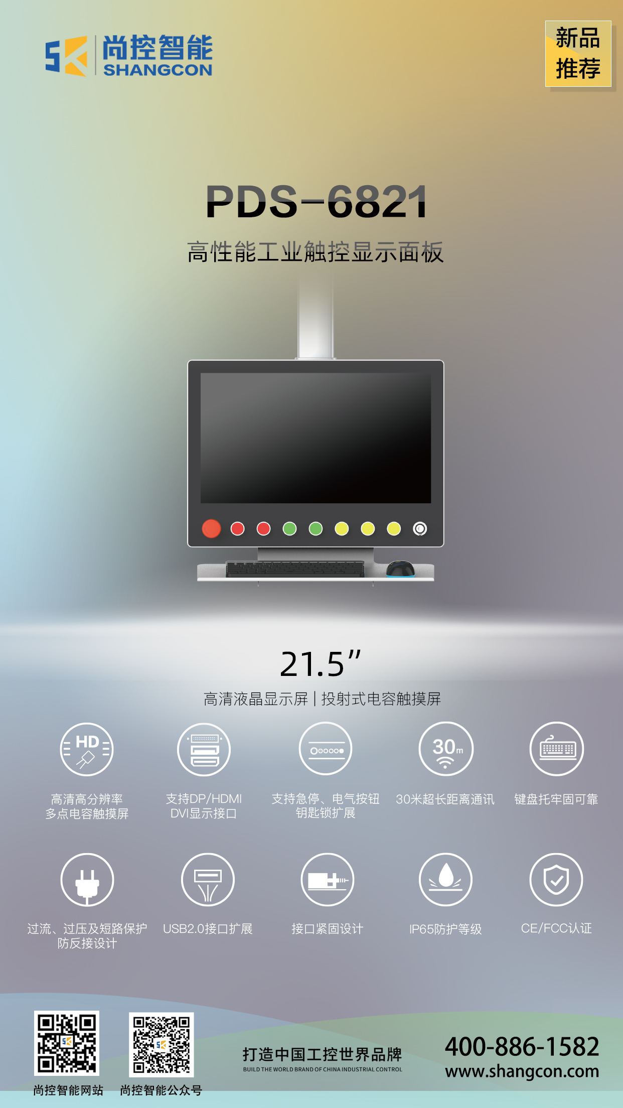 PDS-6821是一款上懸臂安裝的橫屏工業(yè)觸控面板,帶有操作按鈕和鍵盤支架,配備21.5”分辨率為1920x1080的高清液晶顯示屏、投射式多點電容觸摸屏,支持HDMI、DVI、DP三種信號傳輸接口和多個USB2.0接口擴展,PC與觸控面板最遠通訊距離可達30米,整機DC24V供電,前面板IP65防護等級,接口全部采用緊固設計,且通過CE/FCC認證,可適用于嚴苛的人機交互工業(yè)現(xiàn)場。